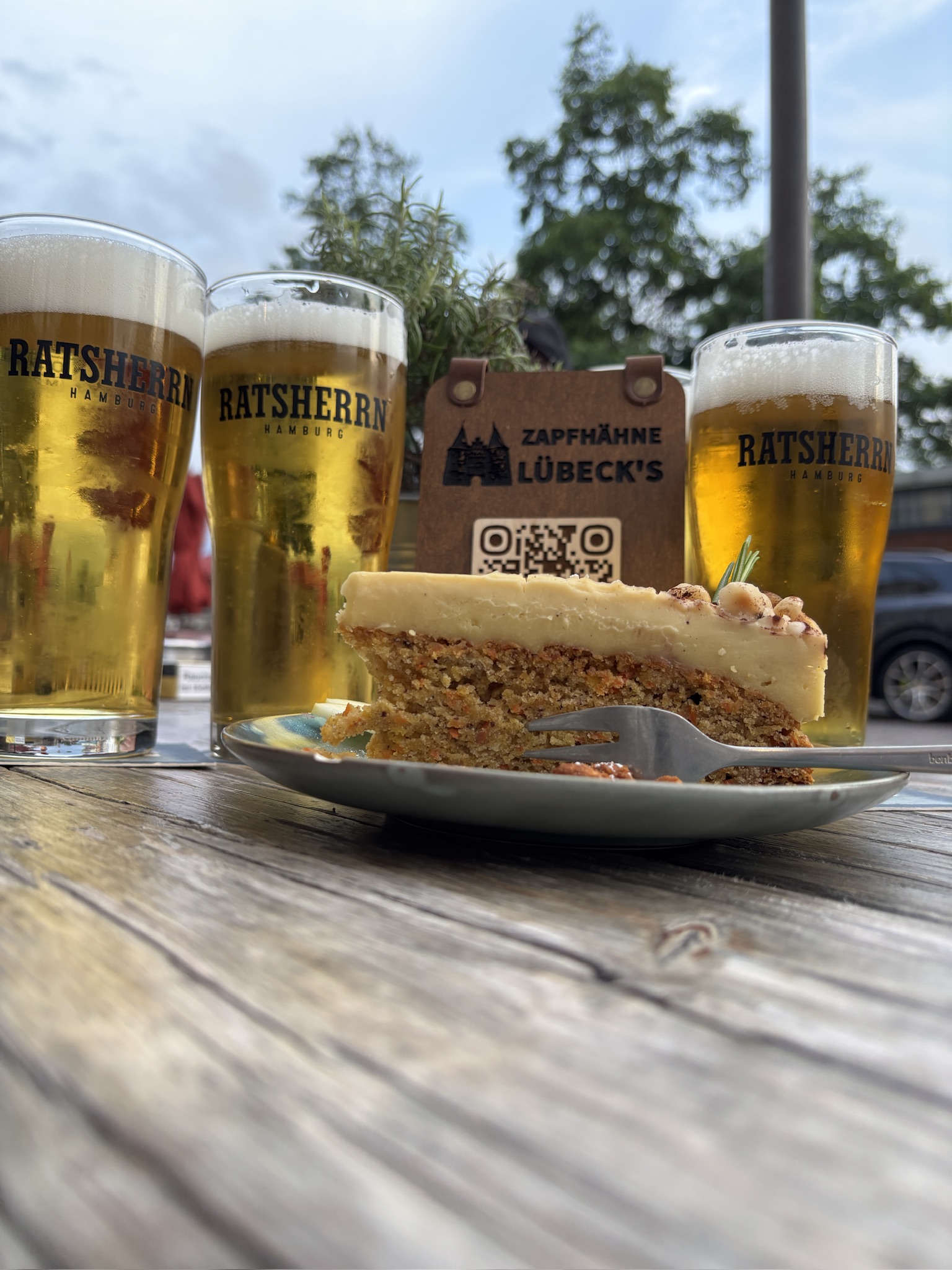 Die Bierauswahl fiel klar und lokal aus: Ratsherrn Helles und Ratsherrn Pilsener liefen vom Hahn, ergänzt durch ein Stück Kuchen, das sich als ideale Begleitung erwies. Trotz später Stunde war der Laden gut besucht, jedoch angenehm gesellig – und die Zapfhähne konnten beide Biere noch in Ruhe probieren.