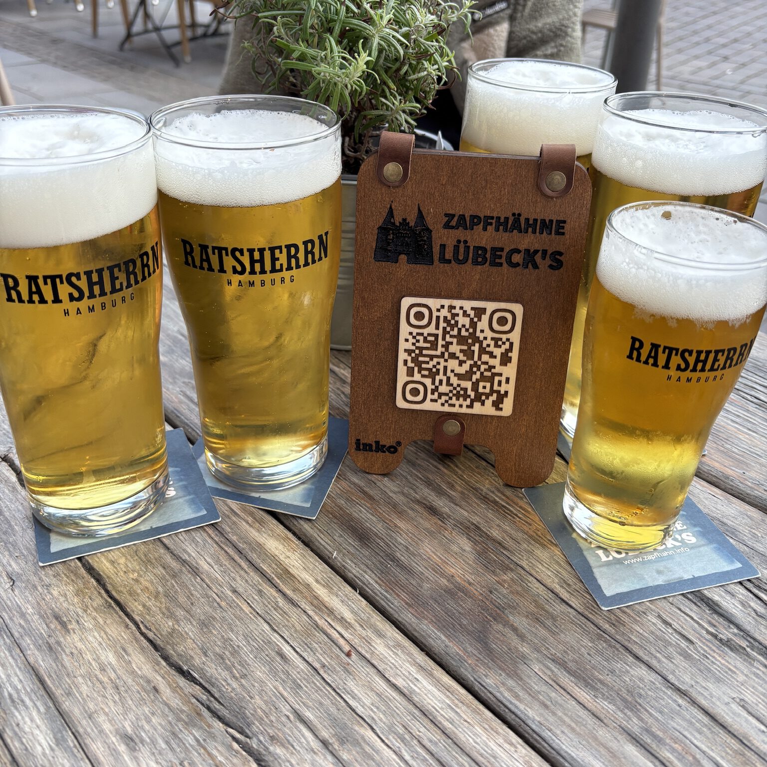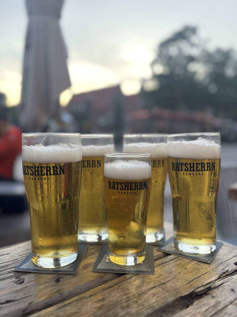 Die dritte Station des Juni-Treffens führte die Zapfhähne in die BLAUPAUSE an der Obertrave – diesmal zu fünft mit der Praktikantin. Ein Platz draußen in der Abendsonne bot die perfekte Bühne, um das Treiben am Wasser zu beobachten.