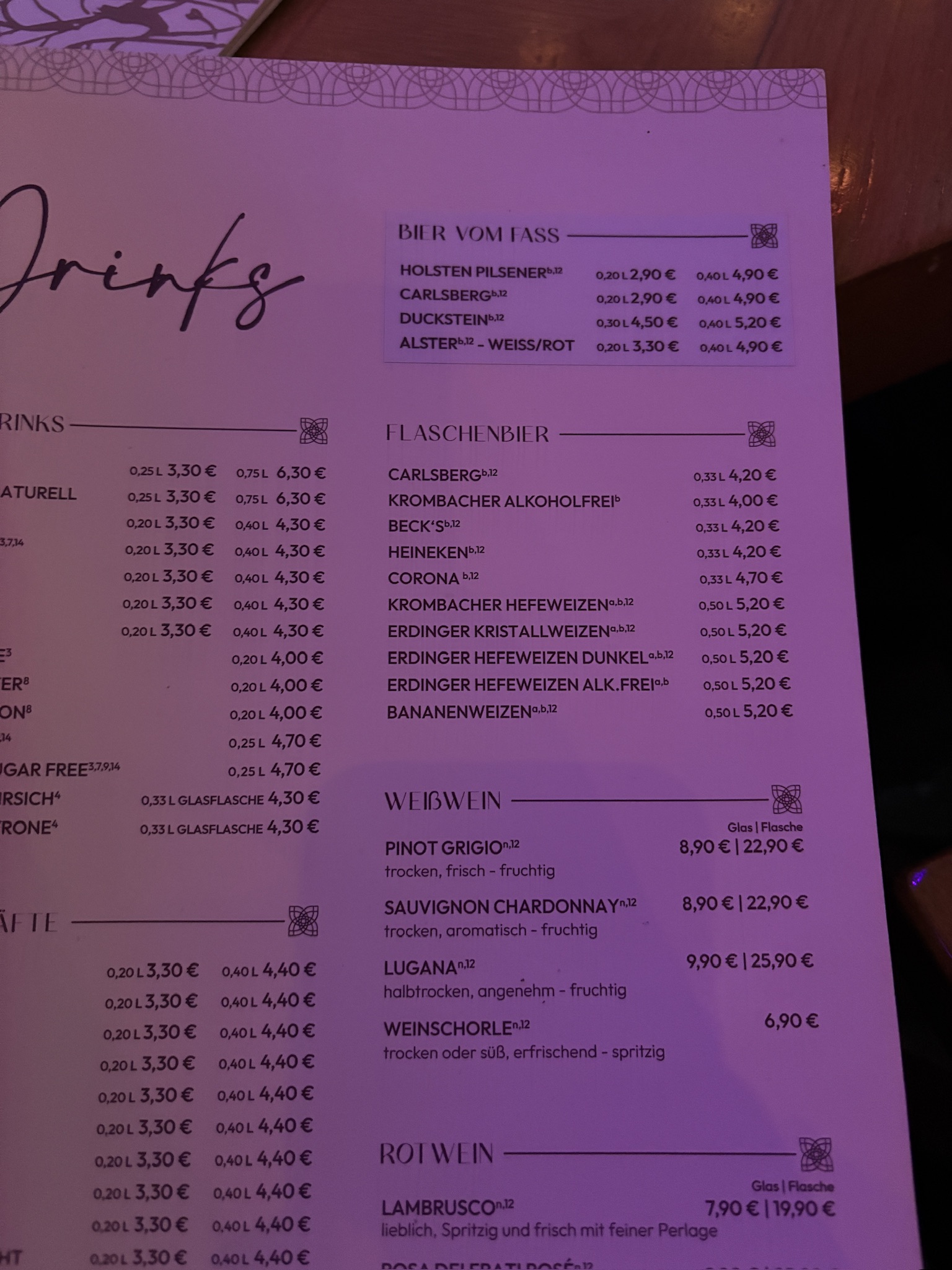 Beim Bier zeigte sich ein gemischtes Bild. Die Runde bestellte Carlsberg, Duckstein und Holsten – wobei letzteres und auch das Duckstein klar durchfielen. Zwei von drei gezapften Bieren wirkten „nach altem Fass“, wie der Azubi treffend formulierte. Das bestätigte am Ende auch das Gesamtgefühl: Das Jazzcafe punktet traditionell bei Cocktails, fürs gepflegte Fassbier scheint es dagegen nicht die erste Adresse zu sein.